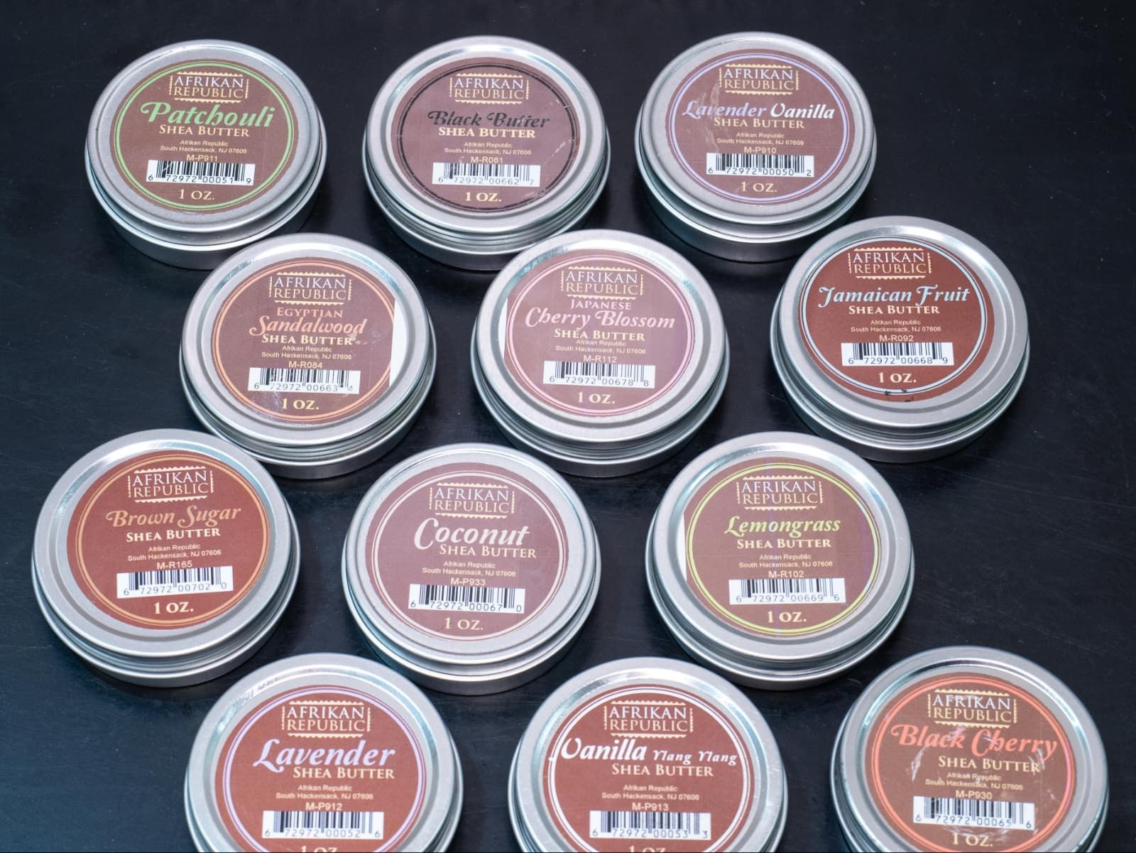 Shea butter tins with various scents including lavender, lemongrass, patchouli, coconut, black butter, lavender vanilla, and cherry blossom.