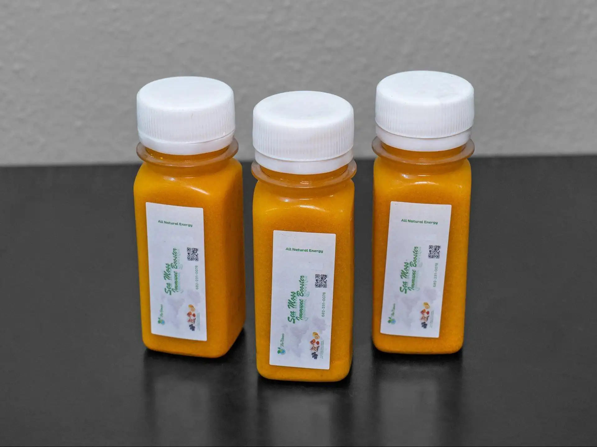 A bundle of three sea moss shots enriched with sea moss, pepper, ginger, and turmeric.